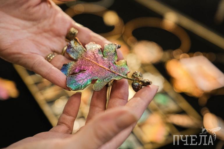 — Когда я достаю меднёные листья — они все розово-коричневые. Дальше я уже думаю, что с ними делать, — рассказала художница. — Радужная патина получается за счёт специального состава с каустической содой, в который опускается изделие. Я включаю ток, и ток окрашивает изделие. Потом смотрю, что получилось, и, если нужно, опускаю ещё раз. Все эти цвета (Ольга показывает на украшения разной окраски) — из одной ванночки.
