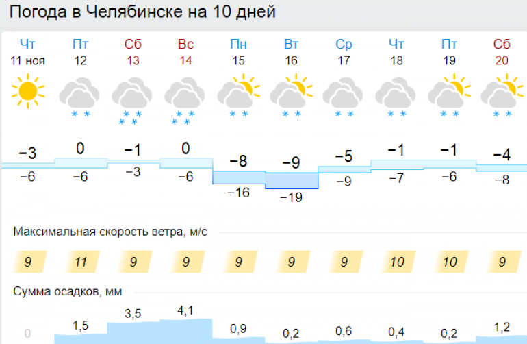 Согласно прогнозу портала Gismeteo, предстоящие морозные выходные — ещё цветочки. В понедельник, 15 ноября, в Челябинске похолодает до -8 градусов днём и -16 ночью. Похожая ситуация ожидает горожан во вторник, 16 ноября. К четвергу, 18-го, немного потеплеет. Столбики термометров покажут до -1 градуса днём. При этом неделя, согласно данным синоптиков, будет снежной.