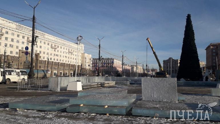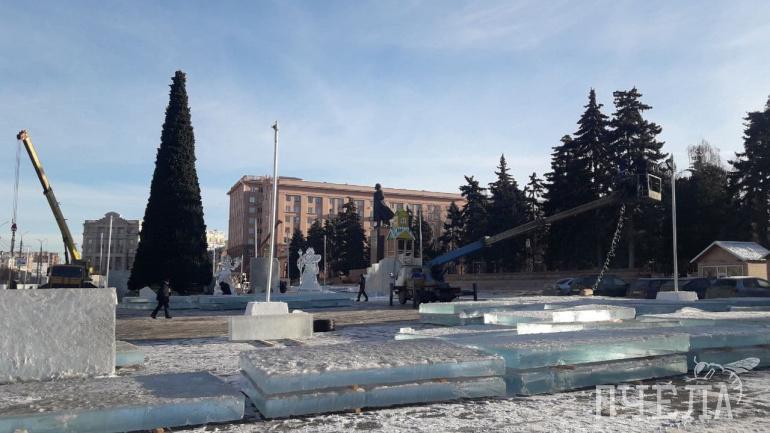 На площади также продолжается возведение ледового городка. В этом году его тема — «Сказочный лес». Не обошлось без недоразумений. В основание скульптур и горок уложили тёмный лёд. Это смутило некоторых горожан. Скульпторы потом успокоили всех: для изготовления фигур они будут использовать чистые прозрачные глыбы. Городок должны открыть 27 декабря.