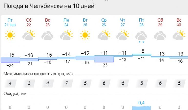 В Челябинск ледяной холод придёт с небольшим опозданием: минувшей ночью было -20…-22, днём ожидается -10…-12 градусов. В ночи на субботу и воскресенье ударят морозы до -27, днём в оба выходных будет от -11 до -13 градусов. Осадков также не ожидается. Прогноз от Гисметео, к слову, более щадящий.