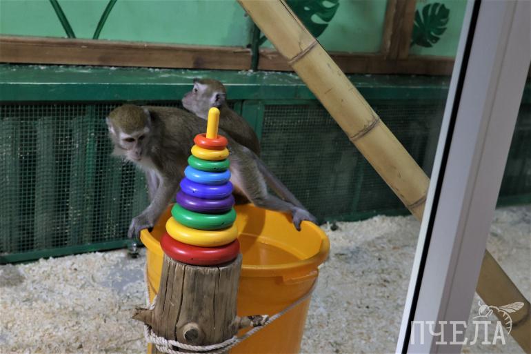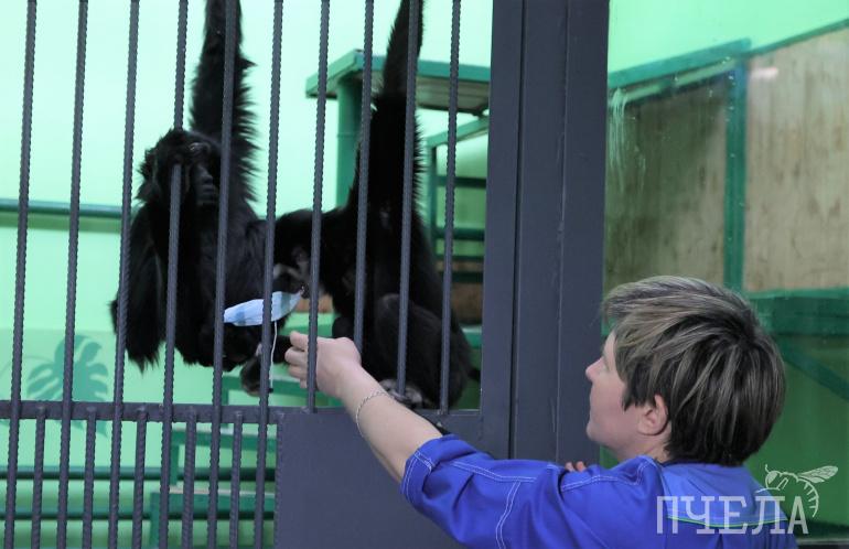 Изъятым у контрабандистов приматам сейчас почти три года. В зоопарке они освоились и стали «своими». Гиббоны славятся любовью к фотоаппаратам, очкам и даже медицинским маскам. Сегодня отобрали маску у кого-то из персонала.