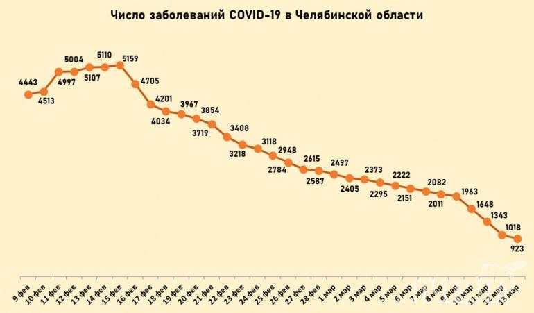 Заболеваемость коронавирусом в Челябинской области продолжает стремительно снижаться. За прошедшие сутки подтвердили только 923 новых случая инфекции. Показатель менее 1 тысячи фиксируется впервые с конца января.