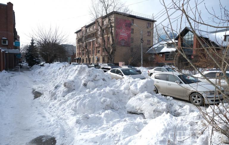 На обочинах дорог даже в центре города лежат снежные валы. Чтобы пройти по «зебре» или сесть в общественный транспорт, горожанам приходится перешагивать через сугробы.