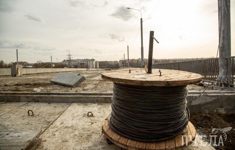Сейчас на мосту ведутся работы по устройству фибробетона, гидроизоляционных слоёв, рабочие также делают насыпи подходов к мосту, опоры наружного освещения. Буквально вчера началась реконструкция трамвайных путей на улице Российской, ремонт путей пройдёт и на перекрёстке Российской с проспектом Победы. Из-за этого движение некоторых трамваев по Российской ограничили. Укладку асфальта планируют начать в июне.