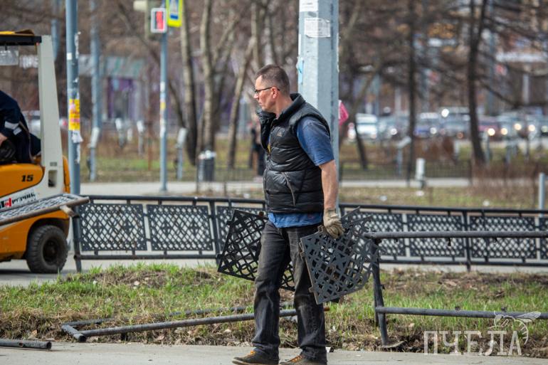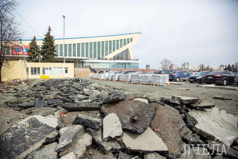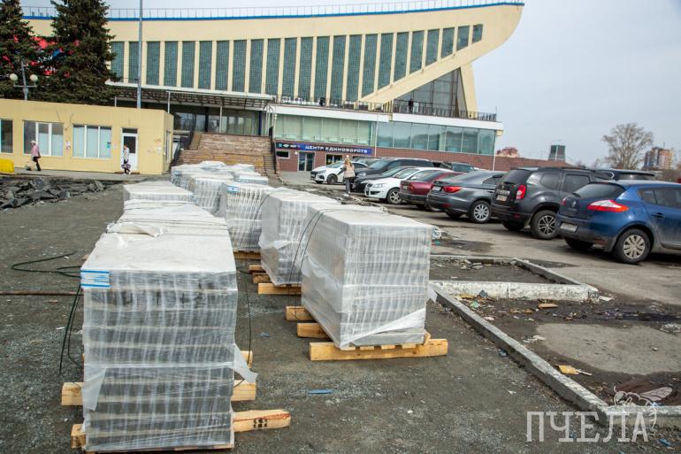 На пустующем пространстве у ДС «Юность», откуда ранее убрали торговые и остановочные павильоны, вовсю кипит работа. Подрядчик снимает старый асфальт, своего часа ждёт упакованная тротуарная плитка, которую уже привезли. Рабочие также снимают маленькие ограждения из каслинского литья.
