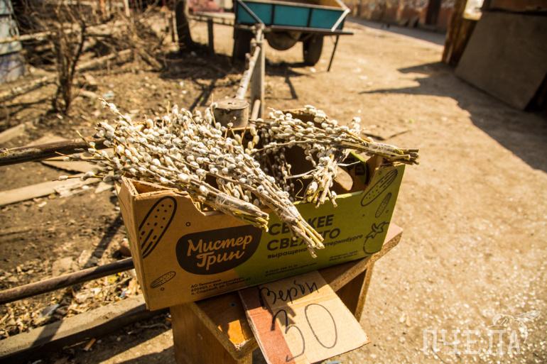 За вербой нашему фотокорреспонденту далеко ходить не пришлось. Он встретил её в палатках рядом с хозяйственным магазином «Юрюзань». За один пучок тут просили не так уж много — от 30 до 40 рублей, поэтому покупали их охотно.