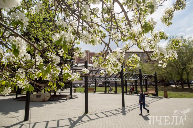 В центре Челябинска расцвели яблони, вишни и кусты кизильника