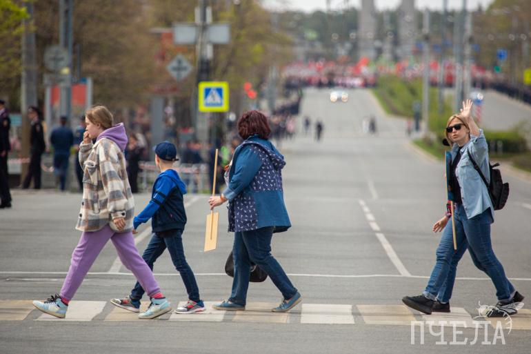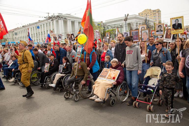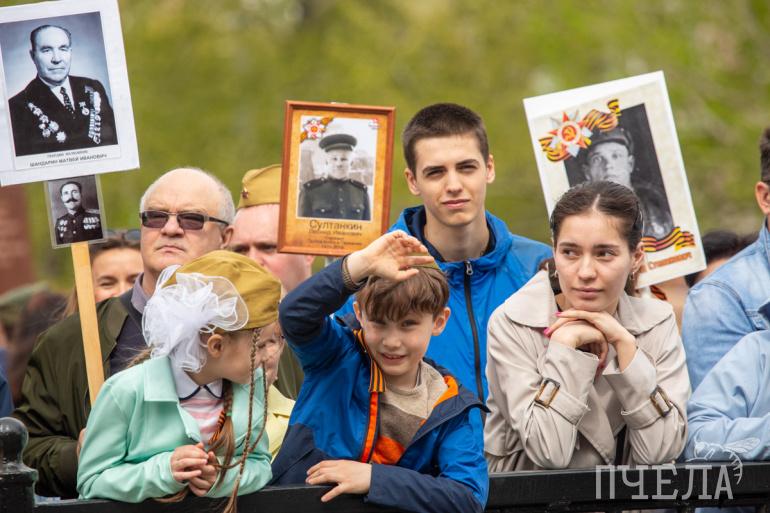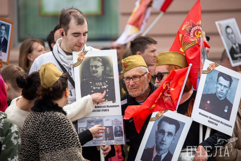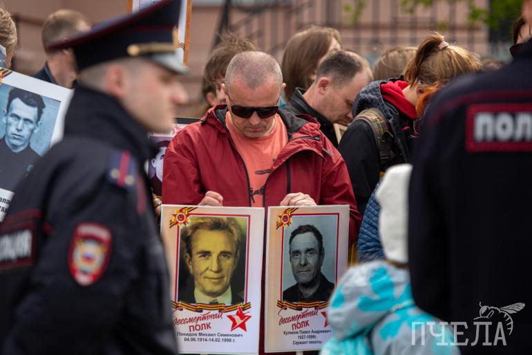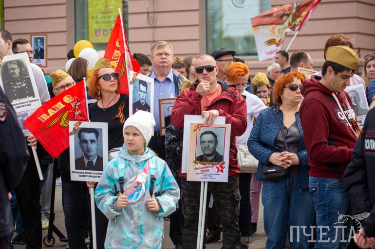 Шествие «Бессмертного полка» стартовало в 13 часов. Участники прошли по проспекту Ленина, а после свернули на улицу Цвиллинга. Там всё и завершилось — у мемориала «Вечный огонь» на Аллее Славы.