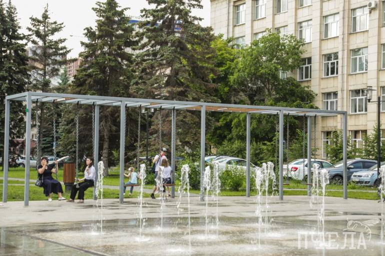 Популярен сквер во многом потому, что в нём построили первый в городе сухой фонтан. У фонтана нет чаши, а значит в жару можно бегать между струями и даже купаться. Этой возможностью вовсю пользуются дети. А ещё некоторые горожане не прочь помыться в таком фонтане, как в душе. Хотя задумка архитекторов вряд ли включала такую функцию.