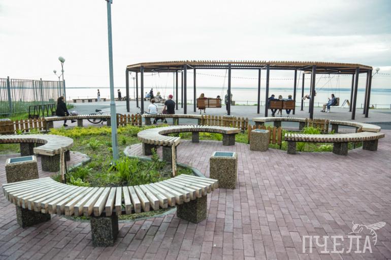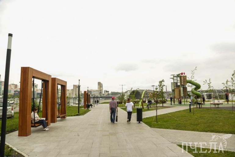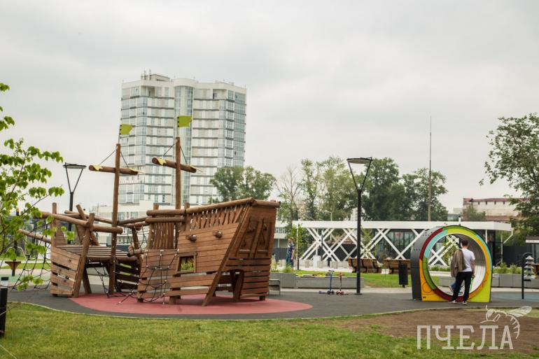 В Арт-сквере расположили сцену, на которой можно смотреть уличные выступления во время праздников. А детская площадка пустует разве что в дождливые и холодные будни. В остальное время к скалодрому, кораблю исследователя, гамакам, качелям и батутам выстраиваются очереди. Аттракционы нравятся не только детям, но и взрослым. Благоустройство набережной обошлось в 489 млн 629 тысяч рублей.