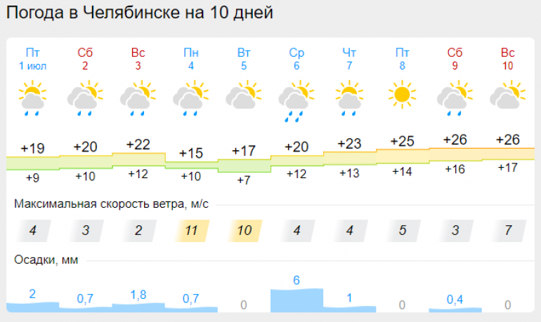 Прогноз портала Gismeteo менее обнадёживающий. Местные синоптики утверждают, что дожди в Челябинске задержатся аж до вторника, 5 июля. Температура воздуха в начале недели при этом упадёт до +15 градусов. Теплеть начнёт к среде, 6 июля, однако всё омрачат обильные осадки.