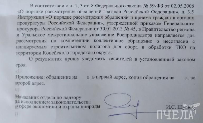 Письмо с таким текстом прислали в редакцию «Пчелы» жители посёлка Старокамышинск. Это ответ прокуратуры на жалобу людей. Надзорное ведомство сообщило, что направило запросы по ситуации в правительство региона, а также в Уральское межрегиональное управление Росприроднадзора. В коллективном обращении в госорган копейчане выразили несогласие с планируемым строительством полигона для сбора и обработки ТКО на территории округа. Недовольство людей можно понять, ведь объект хотят возвести рядом с жилыми домами.