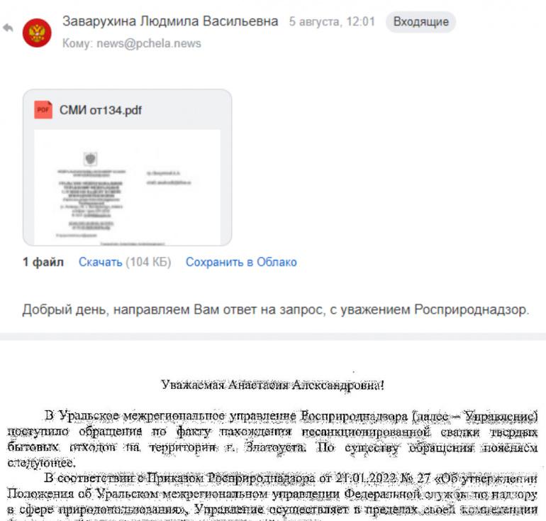 Кроме прочего, указали, что за дополнительной информацией о проверках можно обратиться в Росприроднадзор и Роспотребнадзор, так как их специалисты также принимали участие в проверке. Правда, в одном из ведомств свою причастность почему-то стали отрицать. Приводим скриншот письма: