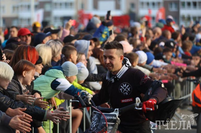Затем челябинцам и гостям города показали мотошоу Алексея Колесникова и его команды FMX13. Оно получилось не менее впечатляющим, ведь спортсмены выполняли такие трюки, от которых захватывало дух. Они взлетали в воздух на мотоциклах, отрывались от сидений и вставали на руки прямо в воздухе.