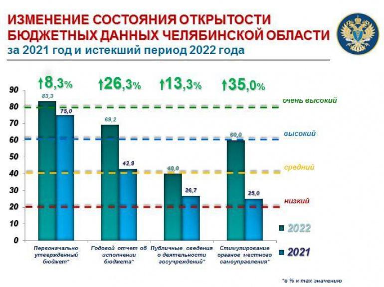 По результатам исследования, Челябинская область набрала 6 баллов из 15 возможных и попала в группу со средним высоким уровнем открытости бюджета. Всего существует пять таких групп от, А до Е (очень высокий — очень низкий). Для попадания в группу требуется, чтобы показатель прозрачности составлял более 80% от общего количества баллов, у Челябинской области — 40,0%. По итогам 2022 года в группе «С» отказалось помимо Челябинской области, который заняла 11-е место, есть еще 12 регионов России.