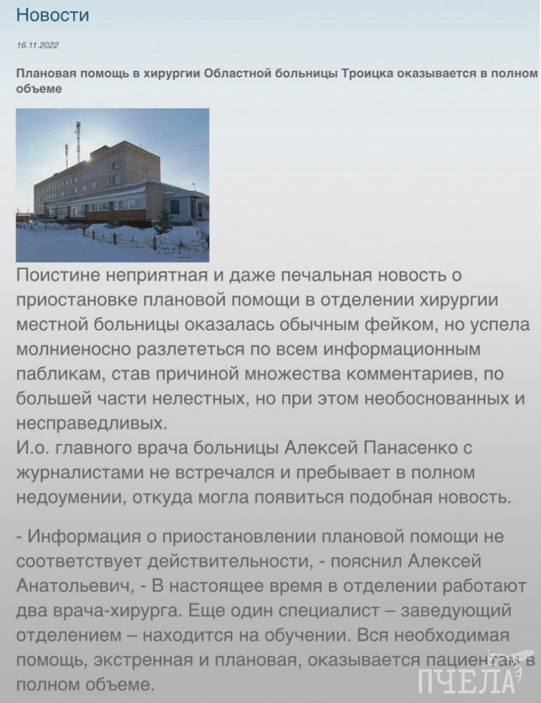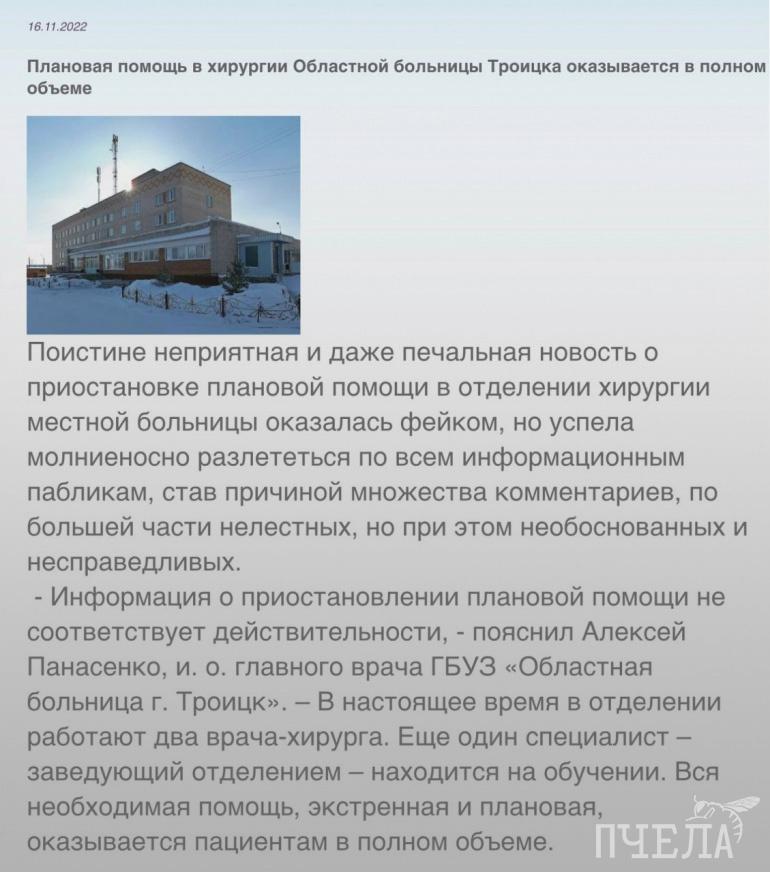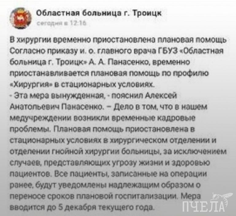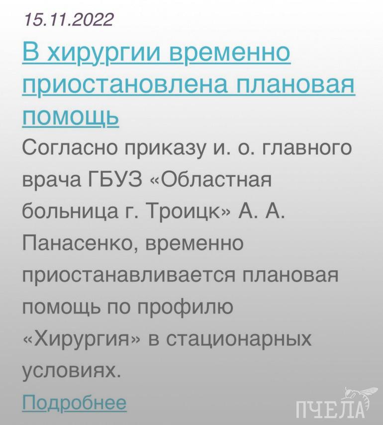 Ситуацию с приказом и удалёнными публикациями в областной больнице города Троицка оставили без комментариев. В медучреждении подчеркнули, что никаких проблем с оказанием хирургической помощи сейчас нет.