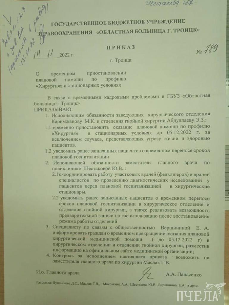 Между тем в распоряжении «Пчелы» оказался приказ и.о. главного врача больницы Троицка, который подтверждает ранее опубликованную информацию о приостановке оказания плановой медпомощи.