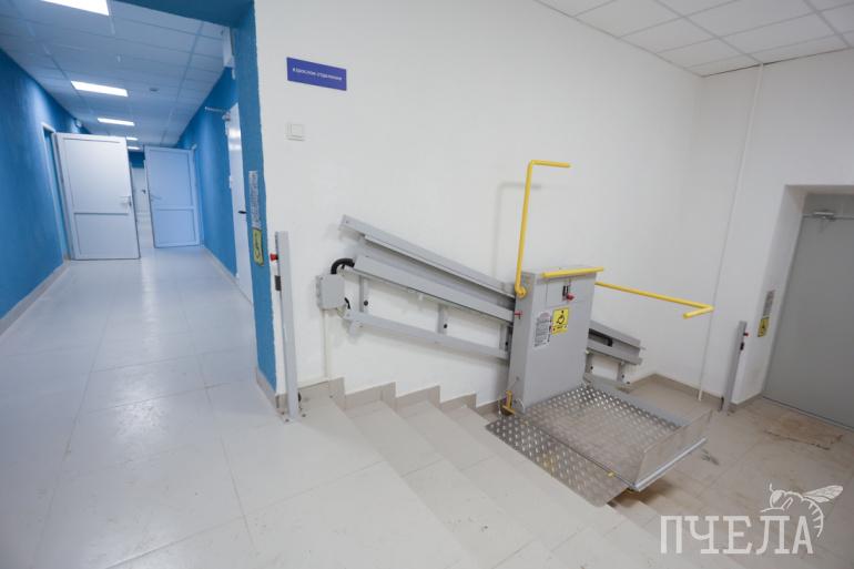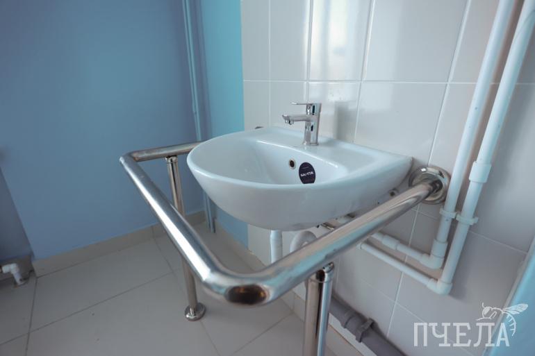 — Для маломобильных пациентов на улице готов пологий пандус, по которому они смогут подняться к лестнице, а здесь уже это устройство — нажмёт на кнопку, в регистратуре раздастся звонок. Такая конструкция пока единственная в районе, — рассказал представитель поликлиники Юрий Терентьев. — В туалет тоже на коляске проехать можно — ширина дверного проёма позволяет. Есть душевая кабина, три водонагревателя — то есть, без горячей воды тоже не останемся.