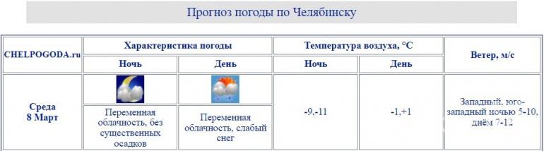 В Челябинске 8 марта ожидается переменная облачность, возможен слабый снег. Температура воздуха днём составит от -1 до +1 градуса. Дополнят погодную картину западный и юго-западный ветра со скоростью 7-12 м/с.