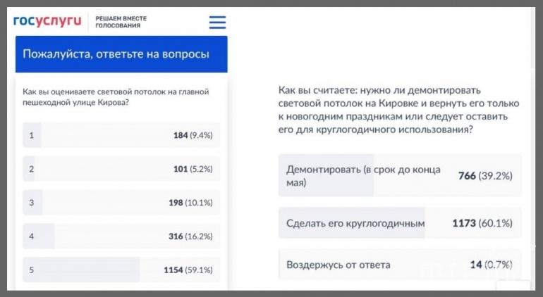 — За то, чтобы световой потолок радовал взгляд круглый год, проголосовали 1173 (60,1%) человек. Ещё 766 или 39,2% респондентов предложили его демонтировать до новогодних праздников, а 14 (0,7%) воздержались от ответа. Таким образом, световой потолок останется на Кировке для работы в круглогодичном режиме, — заключили в пресс-службе администрации.