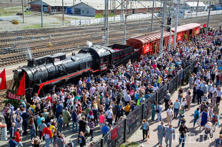 На железнодорожном вокзале Челябинска южноуральцы встретили «Поезд Победы» — уникальный исторический музей, в экспозиции которого запечатлены образы прошлого. В составе поезда были «теплушки» с артистами в форме военных лет и платформа с военной техникой. Горожане смогли по-настоящему окунуться в торжественную атмосферу мая 1945 года. За прибытием поезда вместе с тысячами челябинцев наблюдал и фотокорреспондент «Пчелы».