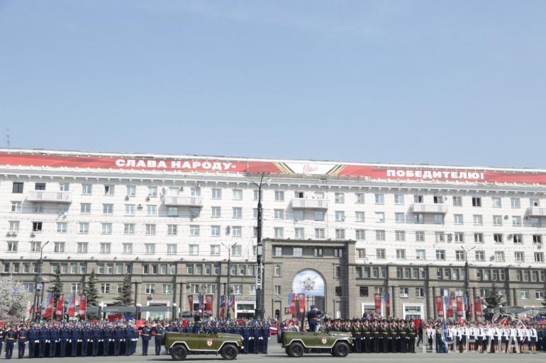 Построение войск челябинского гарнизона началось под песню «Вставай, страна огромная». Курсанты челябинского филиала Военно-воздушной академии торжественно несли флаг России и Знамя Победы. Главный командующий Челябинским гарнизоном объехал площадь и поприветствовал войска. После этого слово взял губернатор Алексей Текслер и поздравил южноуральцев с Днём Победы. Жители города почтили память погибших в Великой Отечественной войне под гимн России.