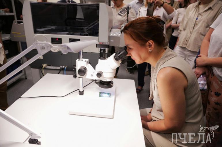 Через микроскоп проверяют, насколько точно изготовилась деталь