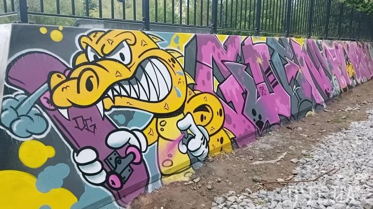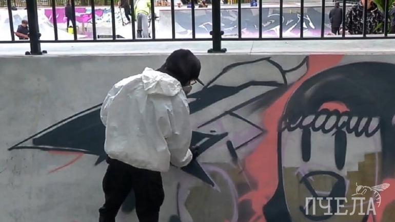 В 10 часов утра команда профессиональных художников и дизайнеров Baza Market Graffiti, несмотря на дождь, начала раскрашивать бетонную чашу и рампы скейт парка. Все рисунки выполнялись в