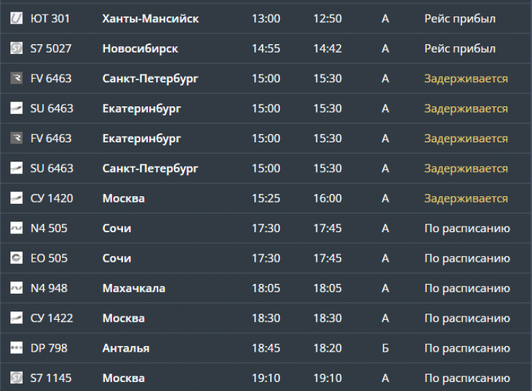 Согласно данным онлайн-табло, сейчас задерживается прилёт самолётов из Санкт-Петербурга, Москвы и Екатеринбурга. Борт из северной столицы отправили в Екатеринбург. А задержку рейса из Москвы объяснили поздним прибытием судна.