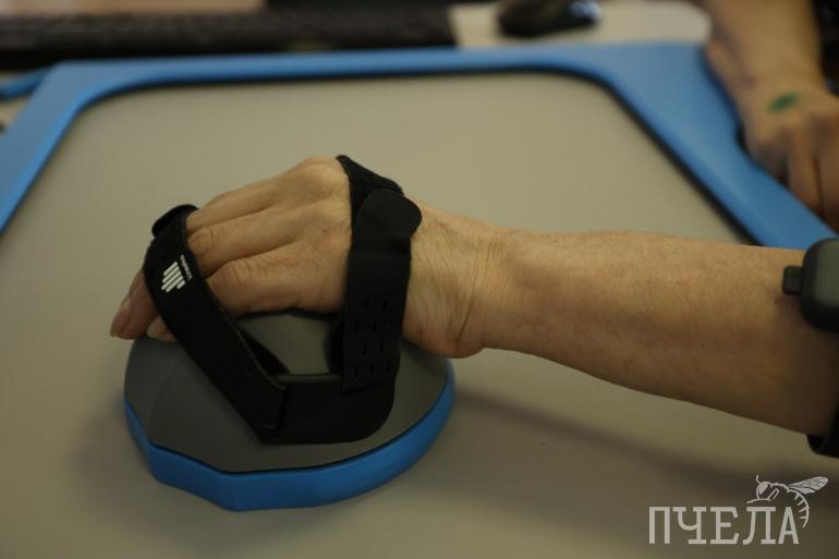 При помощи специального тренажёра женщина учится контролировать свои движения