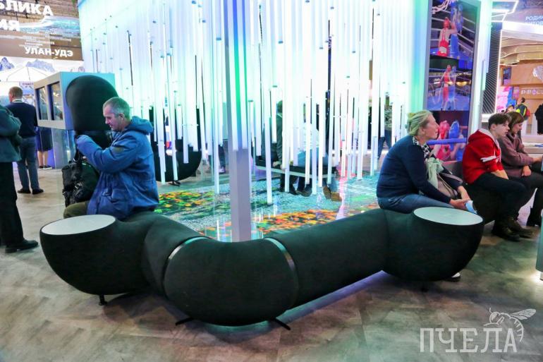 Тех, кто устанет гулять по ВДНХ, ждёт «диванопровод», символизирующий мощь Челябинского трубопрокатного завода…