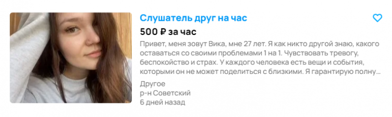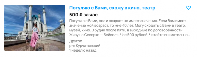 Вариация на тему выше, но с выходом: женщина предлагает прогуляться с желающими по улице, сходить в театр, музей, кино. Час — 500 рублей. Поскольку автор просит пользователей не додумывать, наверняка мужчины усматривали в объявлении пикантную нотку, которой и вправду нет.