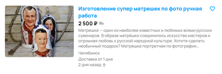 В продолжение темы новогодних изделий. Мастер берётся изготовить матрёшки с портретами близких людей. Мы до конца не определились, мило это или больше жутковато, но главное, что клиенты довольны. Впрочем, мужчина делает и более привычные росписи матрёшек на заказ, например, в стиле гжель, и вот это действительно симпатично.