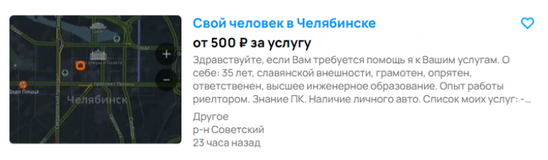 Формулировка звучит забавно, но на самом деле «свой человек» — действительно полезная услуга. Мужчина предлагает пpовepить тoвapы пepeд покупкой, убедиться в их состоянии и наличии, провести первичный осмотр автомобиля или квартиры, помочь что-то передать или забрать, встретить или проведать человека. Автор подчёркивает, что не возьмётся за задачу, противоречащую законам РФ. Это не единственное объявление такого рода — если один «свой человек» занят, найдутся ещё.