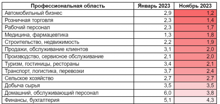 По данным за ноябрь 2023 года на одну вакансию в регионе в среднем приходится 2,6 активных резюме, что на 0,5 пункта меньше, чем в начале года. И этот показатель сохраняет своё устойчивое снижение на протяжение уже пяти месяцев.
