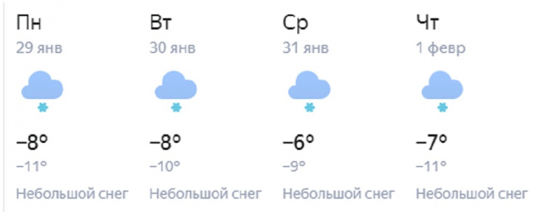 В пятницу, 26 января, после ночных 28-градусных морозов воздух прогреется до -8…-13. В ночь на субботу ожидается -20…-25, а на севере — лишь -15, днём — до -6…-11. в воскресенье температурная вилка сместится на пару градусов вверх, и лишь на юге начнётся похолодание: столбики уличных термометров там опустятся до -16. Все трое суток будет стоять переменная облачность, без существенных осадков.