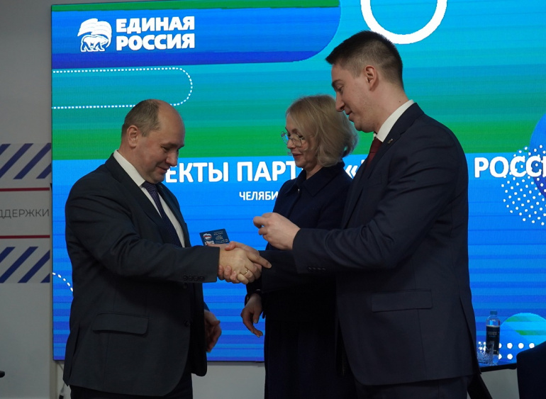 В рамках встречи Ирина Гехт и Виталий Маслов торжественно вручили партийные билеты координаторам партпроектов «Генеральная уборка74» и «Цифровая Россия» Александру Козлову и Ярославу Голубу.