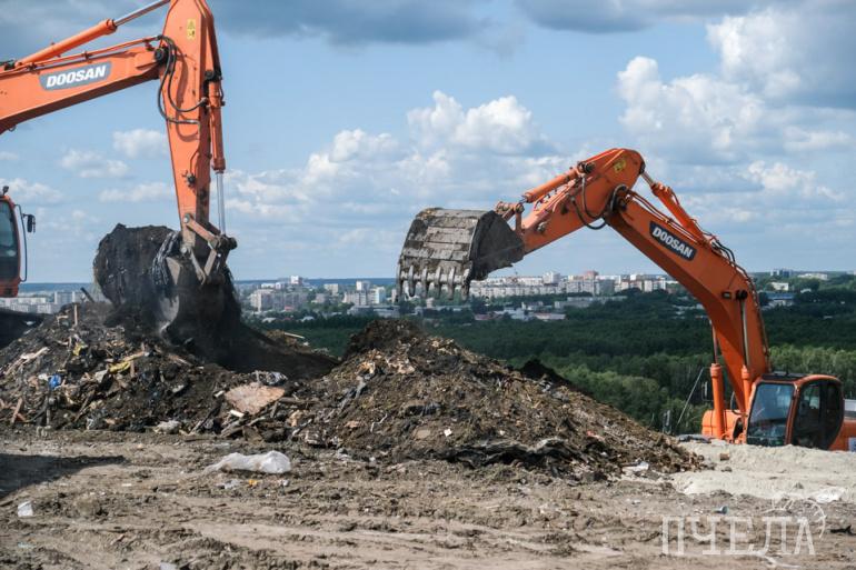 Ежедневно на месте по 12 часов работают 20 человек и 17 единиц техники — шесть автосамосвалов, четыре экскаватора, три бульдозера, каток, поливочная и пожарная машины, а также разбрызгивающая реагенты для подавления запаха аэрозольная пушка.