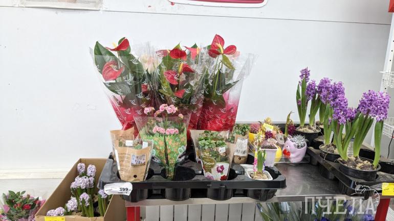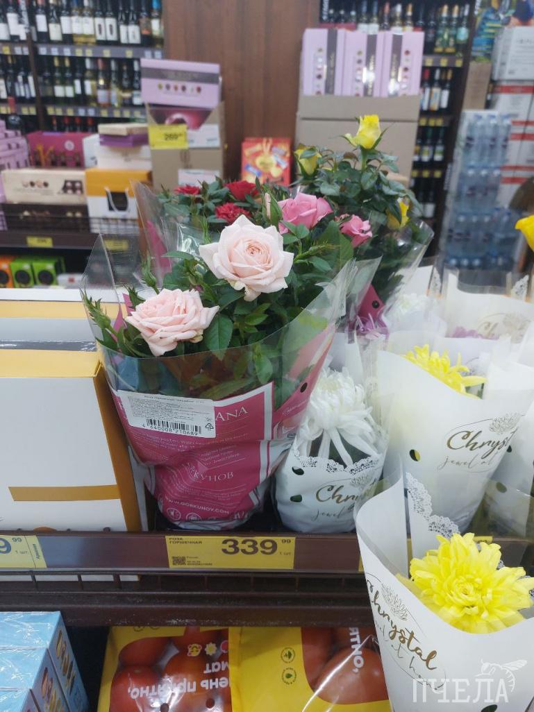 Сеть алкомаркетов «Красное&Белое» тоже решила не отставать. Только у них тюльпанов не купишь. Вместо них на полке стоят кустовые розы в горшочках, которые могут радовать взгляд ещё долгое время.
