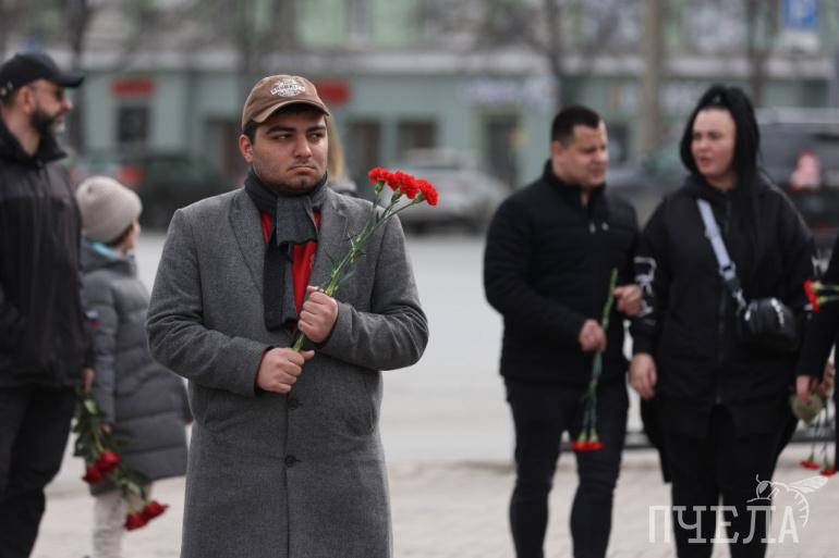 Люди всех возрастов и национальностей приходят к памятнику, возлагая гвоздики и розы