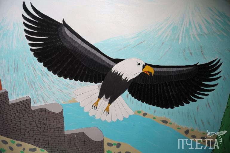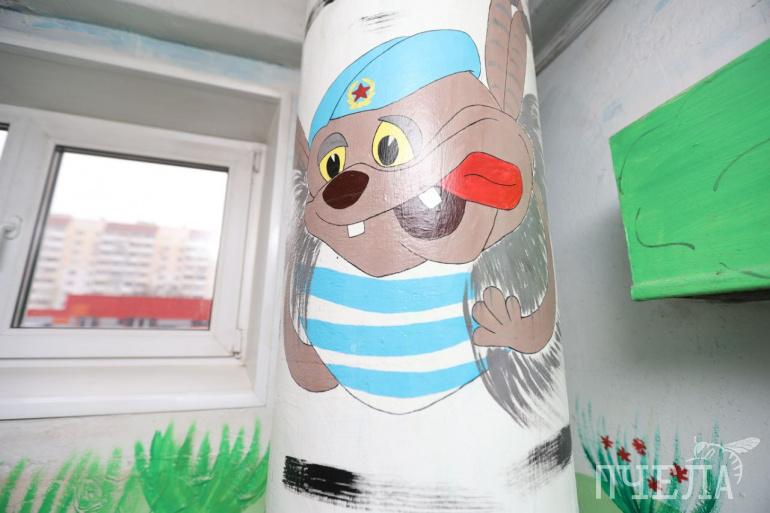 Теперь разрисованные стены являются главной гордостью и украшением подъезда. Интересно, что каждый рисунок связан с жильцами. Например, на одной из стен наши корреспонденты заметили симпатичного паучка в форме Воздушно-десантных войск. Как оказалось, на первом этаже живёт мужчина, который служил в этих войсках.
