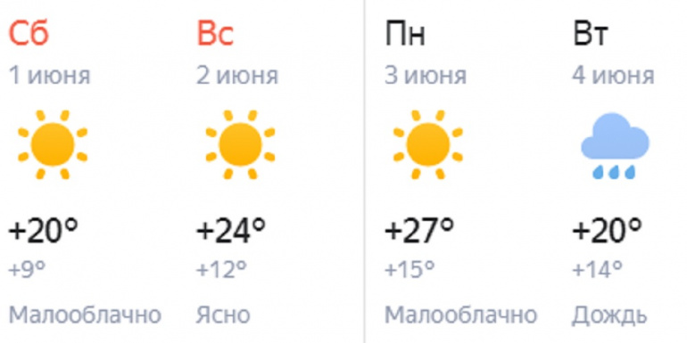 Непродолжительные дожди, грозы и град в регионе местами ожидаются в пятницу, 31 мая. При грозах порывы ветра будут достигать 16 метров в секунду, в остальное он будет гораздо спокойнее. Воздух прогреется до +19…+24 градусов. К этому же набору стихий за исключением града стоит готовиться и 1—2 июня. По ночам столбики уличных термометров будут опускаться до +5…+11, днём в субботу доберутся до +20…+25, в воскресенье — до +23…+28.