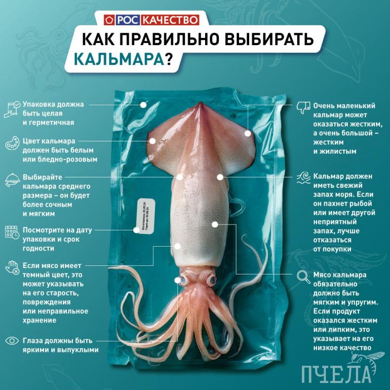 При выборе кальмара нужно обращать внимание на его упаковку, цвет, размер, глаза и запах. Подробнее смотрите в инфографике.