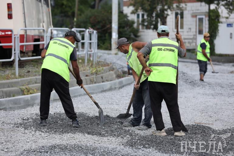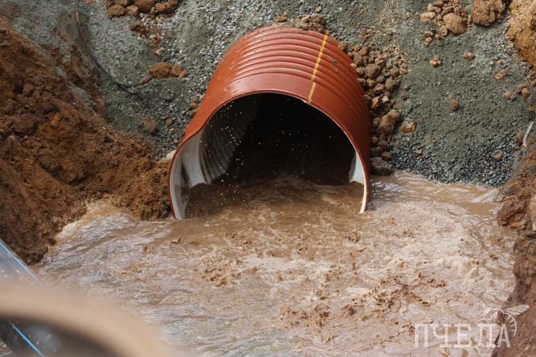 На одном участке — от дома № 25 до дома № 33 на улице Первой Пятилетки — уже уложены новые трубы, восстановлены бордюры и газоны, подготовлено щебёночное основание под укладку асфальта.