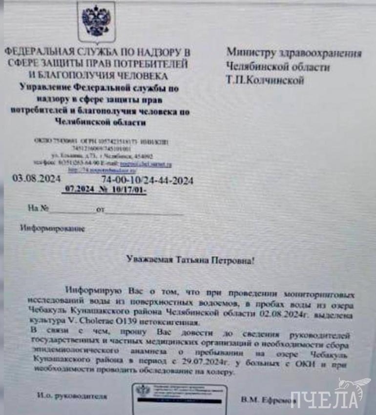 — При проведении мониторинговых исследований воды из поверхностных водоёмов в пробах воды из озера Чебакуль Кунашакского района Челябинской области 2 августа 2024 года выделена культура v. Cholerae О139 нетоксигенная, — сообщается в официальном письме. — В связи с чем прошу вас довести до сведения государственных и частных медицинских организаций о необходимости сбора эпидемиологического анамнеза о пребывании на озере Чебакуль Кунашакского района в период с 29.07.2024 года у больных с ОКИ и при необходимости проводить обследование на холеру.
