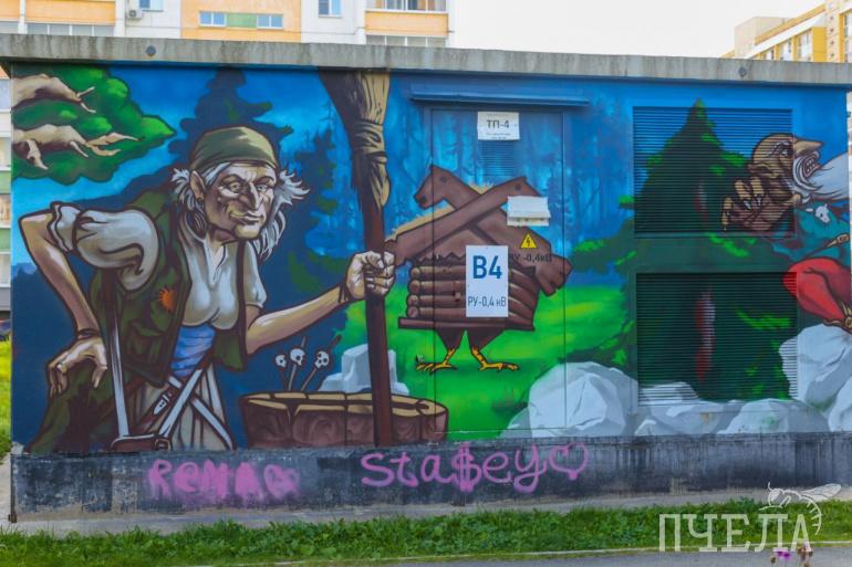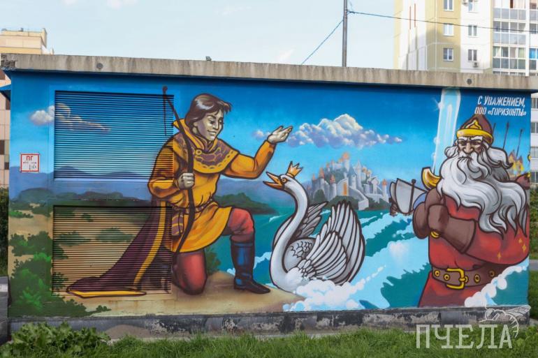 Электробудку на улице Петра Столыпина, 11 в микрорайоне Парковый-2 украсили яркими рисунками по мотивам сказок Александра Пушкина. Среди них — царевна лебедь, рыбак и золотая рыбка, а у дуба с золотой цепью ожидают гостей русалка и кот учёный. Особенно в этом месте понравится детям, которые с удовольствием будут разглядывать героев любимых сказок.