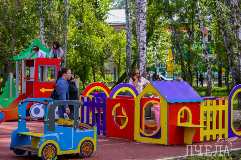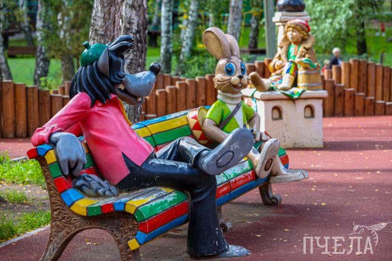 Не забыли и о маленьких жителях Металлургического района — для них построили детскую площадку и преобразили игровой комплекс «Поляна сказок». На этой локации сделали антитравматическое покрытие, установили 10 новых малых архитектурных форм, в том числе игровые конструкции, заменили 13 деревянных скульптур, расширили и отсыпали ручей, высадили более 400 кустов спиреи.