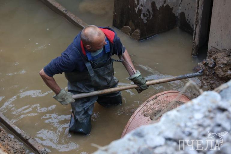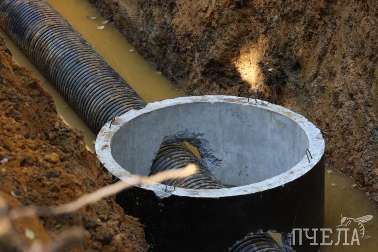 Подобные работы также проходят около дома № 3 на улице Котина. Рабочие меняют 20 метров канализационного коллектора.