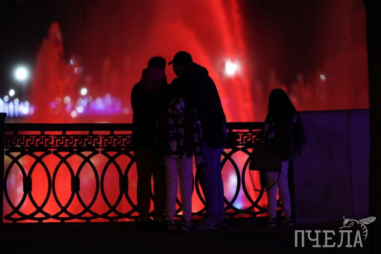 Воскресным вечером в центре Челябинска устроили шоу воды и света — в районе органного зала прошёл заключительный в этом сезоне показ работы светомузыкального фонтана. Посмотреть его собрались сотни человек, среди которых оказался и фотограф «Пчелы».