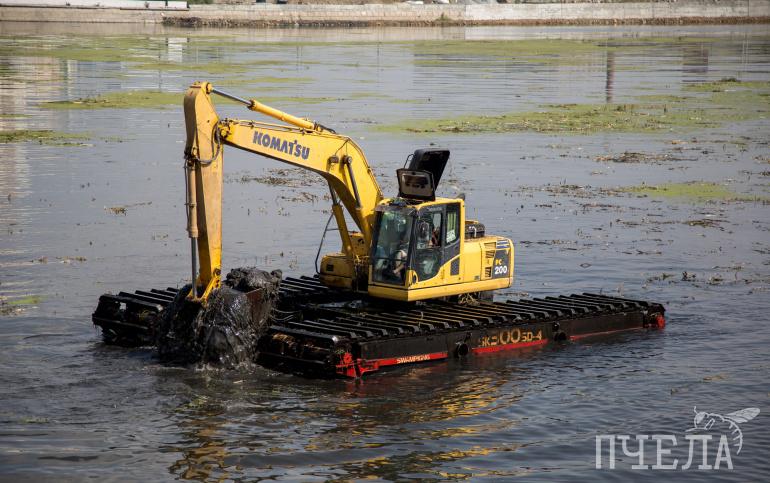 В центре столицы Южного Урала проводится очистка реки Миасс от кустарниковой и водной растительности. В акватории работает экскаватор-амфибия, один наземный экскаватор, два КАМАЗа и две лодки. Сотрудники подрядной организации собирают мелкий и крупногабаритный мусор с поверхности реки без изъятия донных отложений, ликвидации застойных зон и намывных островков.